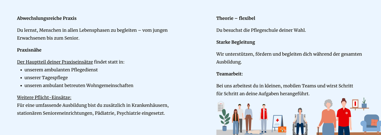 Bist du auf der Suche nach einer abwechslungsreichen und sinnvollen Ausbildung? Dann bist du bei uns genau richtig! Als erfahrener und gut vernetzter Partner im Bereich Pflege bieten wir dir eine hochwertige und praxisnahe Ausbildung, die dir viele spannende Einblicke ermöglicht. Du wirst in verschiedenen Bereichen der Pflege arbeiten, von der ambulanten Pflege über ambulant betreute Wohngemeinschaften bis hin zur Tagespflege.